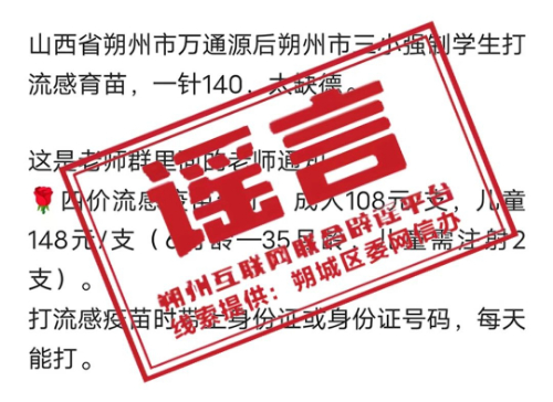 近日,网上发现一则山西“朔州市万通源后朔州市三小疑似强制学生打流感疫苗,一针148?”的消息,经相关部门调查,以上为不实信息,望广大网民不听、不信、不传。